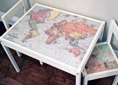 Cette table enfant en bois blanc Ikea un brin impersonnelle est relookée avec une carte du monde en papier peint protégé par deux couches de vernis. Une bonne idée pour faire le récap de la leçon de géographie et décorer la chambre des enfants ! Dans le même esprit, les chaises prennent de l’allure avec des restes de papier peint à motifs cartes du monde.