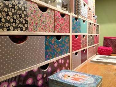 Bonne idée pour donner une touche déco aux casiers de rangement Ikea : les recouvrir avec des chutes de papier peint dépareillées de toutes les couleurs et plusieurs motifs. Ici c’est le thème fleurs et pois qui est décliné, mais vous pouvez créer un patchwork autour d’une seule couleur ou avec un motif à rayures ou imprimé.