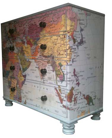 Votre vieille commode ne vous plait plus ? Relookez-la de papier peint. Après avoir poncé le meuble, recouvrez-le de chutes de papier peint et passez une couche de vernis de finition. Illico la commode prend un coup de jeune avec un papier peint carte du monde comme celle-ci.