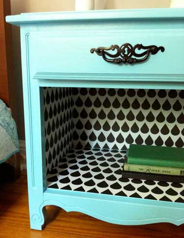 Les chutes de papier peint collées à l’intérieur d’un meuble en bois repeint dans une couleur vive lui donne un look actuel. Ici un papier peint imprimé noir et blanc dynamise la vieille commode en bois repeinte en turquoise.