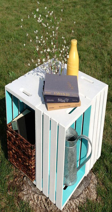 Une desserte ou une petite table de jardin avec rangements intégrés ça vous tente? Celle-ci est fabriquée avec quatre caisses en bois assemblées pour former un carré. Peintes avec une peinture extérieure blanche et turquoise, ces caisses en bois customisées seront du plus bel effet sur la terrasse ou dans le jardin. Légère et compacte, cette petite table sera aussi bienvenue dans un petit séjour ou dans une chambre d’enfant pour ranger tous ses livres et ses jouets.