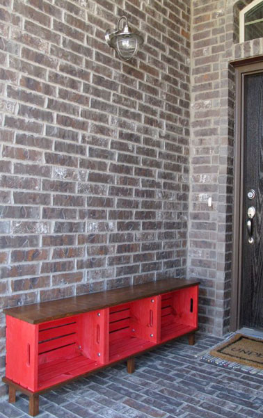 Trois caisses en bois composent cette console de rangement et donnent de l’allure au perron avec leur belle couleur rouge pompier. Faites la même chose en peignant trois caisses en bois dans un coloris vif (laissez les caisses à l’état brut si vous préférez la sobriété ) et boulonnez les caisses les unes aux autres pour former les casiers de rangement. Vissez une planche au dessus et au dessous des caisses et rajoutez des pieds. Appliquez enfin une couche de vernis et vous obtenez une console d’entrée ou un range chaussures bien pratique avant de rentrer à la maison.
