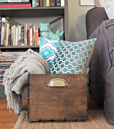 Une caisse en bois transformé en petit rangement de salon