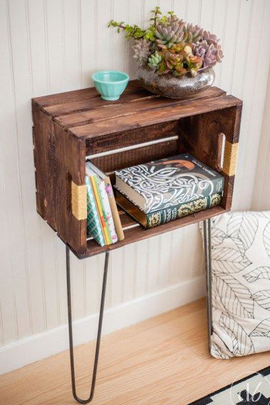 Notre caisse en bois se transforme ici en meuble de rangement tendance. Une idée à reprendre à votre compte avec des pieds de table en épingle à cheveux et une caisse en bois de récup. Pour obtenir ce rendu usé, la caisse est préalablement passée au vernis à vieillir. Les poignets sont entourées d’une ficelle dorée. Deux pieds en épingle à cheveux sont enfin vissés sous la caisse. Au final ce meuble stylé peut servir de table de nuit dans une chambre ou de rangement dans un salon, une entrée et (pourquoi pas) dans une salle de bain.