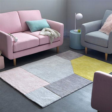 Décidément la déco d’un salon gris et rose ça fonctionne bien, c’est même mimi quand le salon est petit. Une bonne idée que ce sol gris anthracite et murs gris pastel pour faire ressortir le rose poudré du canapé. Le tapis graphique se coordonne avec les différentes nuances et introduit une dynamique avec un jaune en contraste.Tapis coton tufté graphique Dario Dimensions 2 tailles disponibles, 120X170 cm prix 94.00 € Canapé 2 places Jimi prix 259 €.