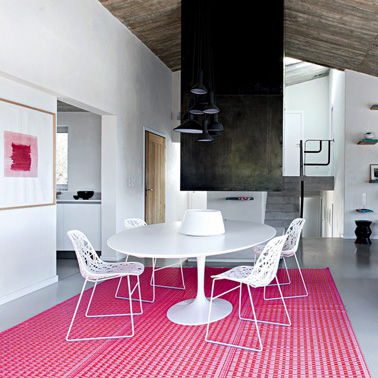 Et oui, on ose un tapis rose sous la table pour égayer une salle à manger blanche. Tapis en polyester et acrylique chez Fly prix : 99 €.