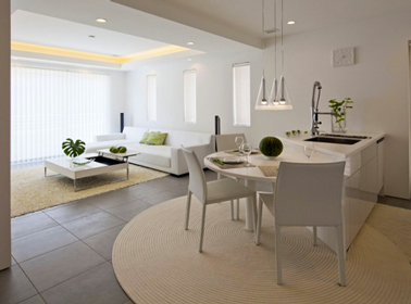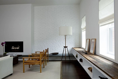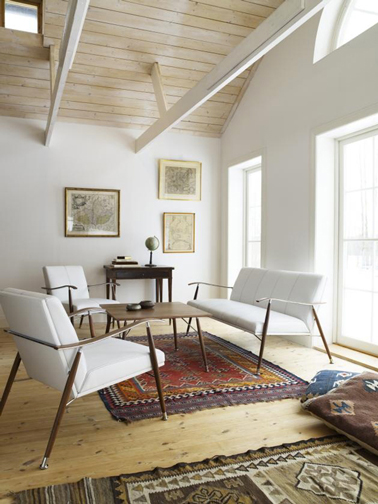 Zéro faute pour la déco de ce salon zen qui marie à merveille couleur froide et teintes chaudes. Murs, canapé et petit fauteuil blanc mettent en avant le blond doré du parquet chêne clair et du lambris au plafond, les rouges et marrons des tapis et coussins de sol subliment le tout.