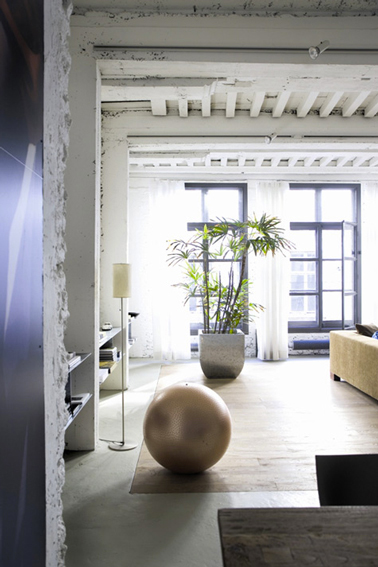 Pour faire vibrer le salon d’une ambiance zen propice à la détente, les couleurs neutres, la peinture mate, les meubles et les revêtements de sol dans des matières naturelles sont de mise ! Bel exemple avec la déco de ce salon aux murs recouverts d’une peinture blanche finition mate et les lignes et couleurs sobres des meubles qui gravitent autour. On aime le parquet de chêne clair et le tapis de laine couleur lin clair qui permettent de séparer visuellement le salon de la salle à manger, alors qu’un béton beige couvre le sol du salon. On adore le big abat-jour effet métal dans lequel se reflètent les différents espaces du salon.