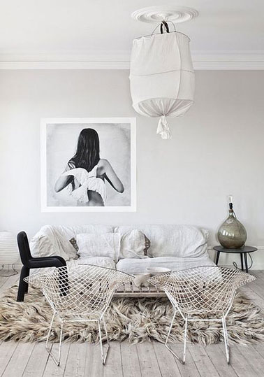 Pour créer une ambiance couleur chaleureuse et zen dans un salon autour de la peinture blanche quoi de mieux que les couleurs naturelles comme pour la déco de ce salon où les deux tapis de couleur lin clair illuminent généreusement la pièce avec la complicité des nuances de vert en touches discrètes mais efficaces.