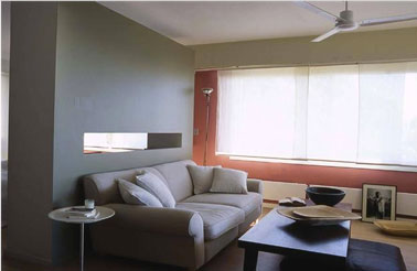 Pour la déco de ce salon gris et rose, la couleur joue l’élégance et la douceur. Le gris vert de la cloison qui accueille le canapé pose un heureux contraste avec le rose bruni qui entoure la fenêtre, chacune des couleurs mettant en valeur l’aspect chaleureux de l’autre et souligne les lignes de l’architecture de l’espace.