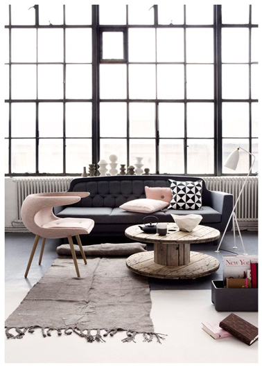 Du rose tendre apporté en couleur complémentaire aux nuances de gris dominant dans un salon avouez que cela donne une ambiance hyper raffinée et même si le rose est en général synonyme d’une déco féminine, il n’y a aucune raison que le mariage du gris et rose ne puisse se concevoir pour dans un salon familiale. Dans cet immense salon aménagé dans un loft peint en gris pastel du sol au plafond, le fauteuil et les coussins d’un rose très tendre subliment cette monochromie et donnent un coup de projecteur sur le canapé gris anthracite. Le touret en bois qui sert de table basse, le tapis de jute taupe rosé équilibrent les valeurs chaud/froid de la pièce.