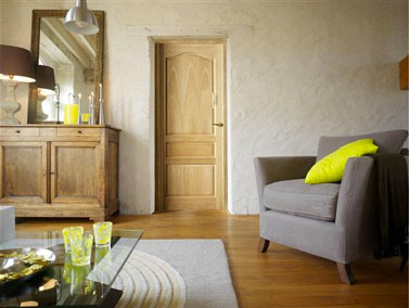 En poussant la porte de ce salon c’est un ambiance faite de douceur et de sérénité qui nous accueille. Une impression renforcée par le contraste entre le bleu intense de la porte et les teintes adoucies du salon : Les murs sont peints avec un blanc légèrement teinté, le revêtement du fauteuil d’un gris mastic salon. Une réalisation qui démontre la large latitude que nous offre le gris de pouvoir l’utiliser en dégradé ou en contraste avec d’autres couleurs.