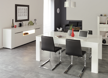 Cette salle à manger allie esprit classe et contemporain grâce à cet ensemble chaises aux pieds traineaux/table imposante qui constitue un duo noir et blanc simple et efficace. La table Bercy à l’aspect robuste donné par sa structure en mélamine s’habille d’une couleur blanc laquée qui ajoute une touche déco tendance à la pièce. Petit plus, cette table ne se contente pas de son design, elle propose aussi une rallonge centrale pour s’adapter tant aux petits espaces qu’aux grandes surfaces. Un bonus pour passer en un éclair du repas de famille au dîner en tête à tête !