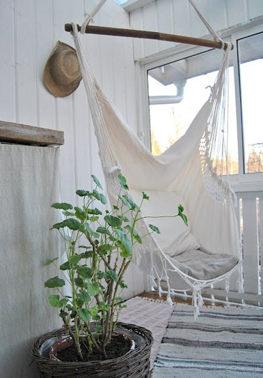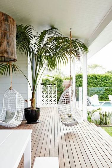 Déco terrasse blanche scandinave avec un fauteuil suspendu