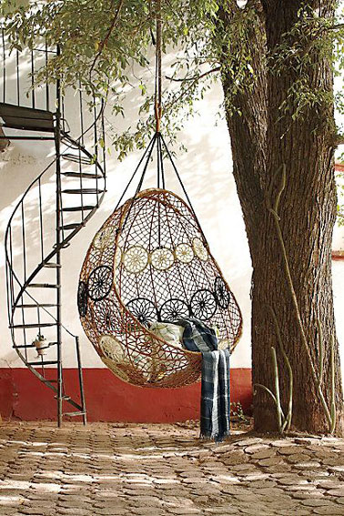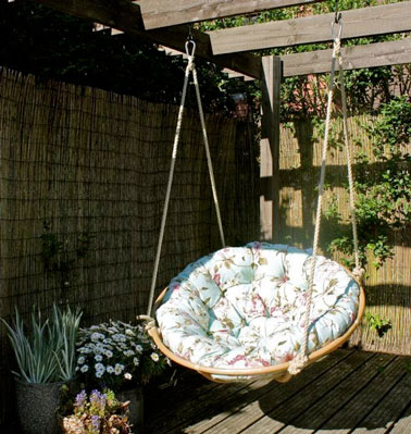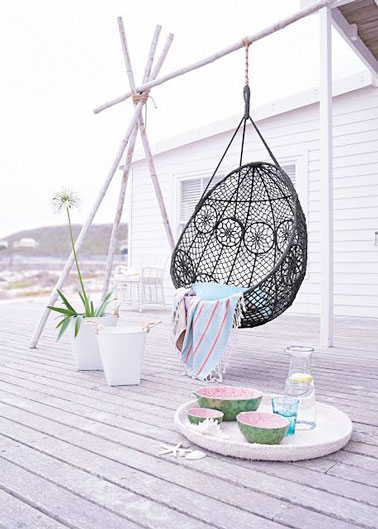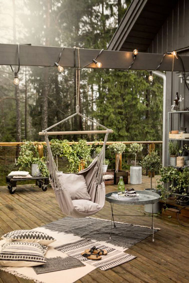 Aménager un espace déco sur la terrasse avec un fauteuil suspendu