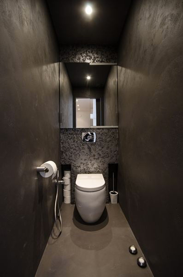 Une déco de toilettes grise conçue autour de matériaux nobles et de couleurs profondes qui augmentent l’impression d’intimité du lieu. Changeant de la peinture WC, sur les murs du stuc couleur gris taupe et un papier peint métallisé dans les mêmes nuances, au sol un béton ciré couleur taupe qui met en avant les lignes épurées de la cuvette WC blanche. A noter, les 2 spots encastrés dans le béton ciré qui diffusent une lumière douce et celle du plafond qui au contraire est brute pour compenser le gris profond et le plafond noir de ces toilettes design.