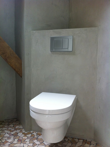 L’enduit effet béton gris c’est sobre et chic dans les toilettes et ça met en valeur le blanc immaculé des WC suspendus et l’élément de commande en inox de la chasse d’eau encastrée. Le sol en mosaïque de carrelage cassé s’offre la fantaisie de reprendre la dominante de couleurs dans les toilettes et celle de la poutre en bois.