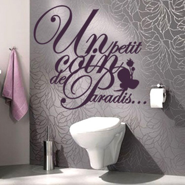 Un sticker géant sur une tapisserie aux grandes fleurs grises pour confirmer le plaisir de se retrouver dans un coin toilette chic et confortable pourquoi s’en priver d’autant qu’il s’harmonise avec le gris pastel du sol PVC et le parme de l’essuie-main !