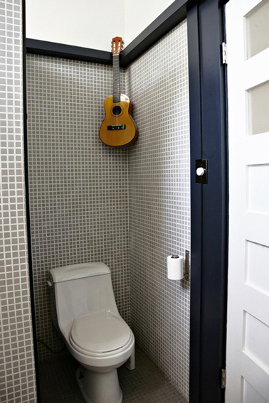 De la mosaïque grise pour la déco des toilettes c’est chic ! Aux murs mosaïque gris pastel avec joints blancs, en contraste le sol est carrelé d’une mosaïque gris anthracite, le tout est mis en valeur avec une peinture bleu marine et blanc pour les boiseries. Une petite touche déco avec un objet insolite dans les WC et voilà des toilettes originales et sympa.
