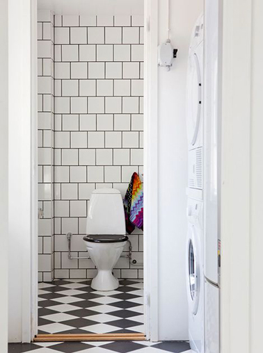 Mes toilettes seront en gris et blanc ou ne seront pas ! Dans ces toilettes un bel équilibre entre le carrelage au sol gris anthracite et blanc posé en damier et la faïence murale blanche aux joints gris.