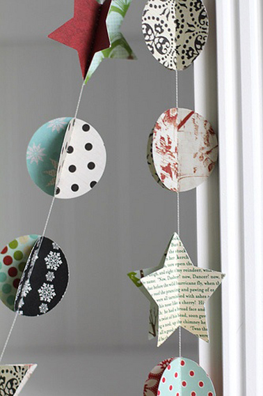 Avec cette guirlande faite avec des chutes de papier tout est permis pour imaginer une déco de Noël originale et créative. Pour la fabriquer, on découpe boules et étoiles dans des chutes de papier peint, des pages de magazines, du papier journal que l’on colle sur une fine cordelette.