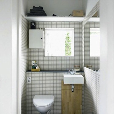 Même concept de pose des éléments sanitaires dans ces petits WC mais ici le carrelage blanc aux joint gris posé sur les trois murs profite de la bonne hauteur sous plafond pour intégrer une étagère bien pratique pour le rangement. Le grand miroir permet de donner une impression de largeur.