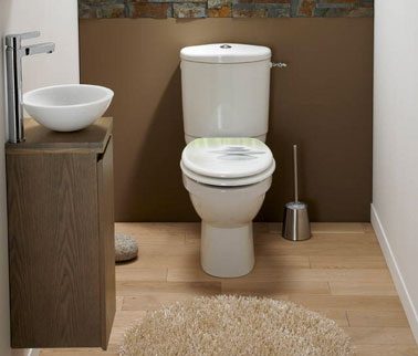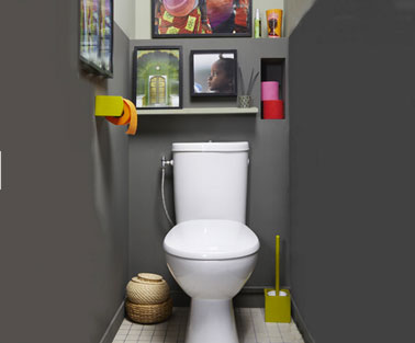 Pour la décoration de ces WC, sobriété de la couleur pour les murs avec une peinture gris anthracite qu’animent les touches de couleurs vives apportées par les accessoires WC d’un vert flashy et les rouleaux de papier toilette de couleurs vives. Astuce rangement : Une tablette en bois peinte en gris perle et des casiers de rangement intégrés dans la contre cloison dernière la cuvette. WC à poser design Club Perline.