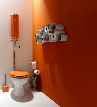 Dans ces WC de petite surface, la peinture couleur orange du mur, la chasse d’eau rétro et les rangements assortis mis en contraste avec un blanc pur apportent luminosité et impression d’espace. Pour le rangement du papier toilette, des journaux…Une idée sympa et facile à réaliser avec des tubes PVC fixés au mur. Réservoir WC haut Griffon orange, 239 € chez Leroy Merlin.