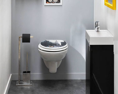 Une déco WC pour visiter New- York le temps d’une pose ! Lave-mains intégré au meuble de rangement aux lignes épurées aspect brillant. Encadrement du miroir peint en jaune vif pour apporter une touche de couleur dans ces WC noir et gris. WC suspendu Solemur blanc.