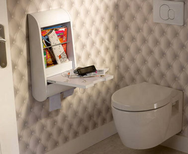 Pour les mordus de lecture dans les petits coins, une idée déco efficace pour le rangement des livres et revues, le meuble étagère style bibliothèque. Ici, le meuble en bois s’intègre parfaitement autour de la couleur chocolat des murs, des accessoires WC et du store à lamelles en bois. Sur la colonne d’évacuation une peinture rouge cuivré qui reprend la couleur de la suspension cuivrée. Au sol, un revêtement PVC motif pois couleur taupe métallisé Réf. sol vinyle 4 m Paris. Prix : 11.90 € le m2 chez Leroy Merlin.