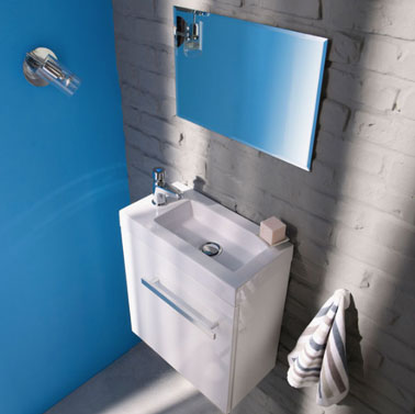 Une déco WC en gris et Bleu. Le mur qui supporte le meuble lave-mains est peint en gris mat et contraste avec la peinture bleu pacifique aspect satin. Peinture et meuble lave-mains en résine réf Seymour chez Castorama.