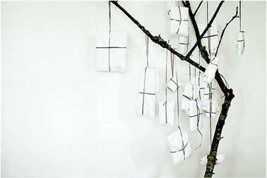 Pour rompre avec le sapin de Noël traditionnel, une branche ramassée dans les bois à planter dans un cache-pot en zinc rempli de sable ou gravier (pour rester dans le noir et blanc) sur laquelle vous accrochez des petits paquets cadeaux fictifs ou pas. Source :  Daniella Witte