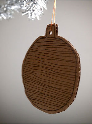 Boule de Noël réalisée avec du carton ondulé et décorée au stylo noir à crocher dans un sapin de Noël blanc ou argenté Dans le même esprit, je fais mes décorations de Noël pour 2 francs 6 sous, des boules de Noël fabriquées avec du carton d’emballage qui peuvent être vernies, décorées au crayon de couleur, avec des paillettes dorées ou argentées. Source : Lokal 54