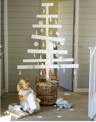 Pour une décoration de Noël de style épuré, un sapin de Noël réalisé avec des planches de bois peintes en blanc. Boules et décorations en blanc également