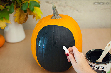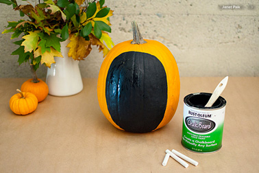 - Appliquez 3 couches de peinture à tableau noir en formant un cercle un peu élargi de 10 cm à 12 cm de large sur la partie la plus plate de la citrouille. Bien respecter le temps de séchage entre les couches successives.