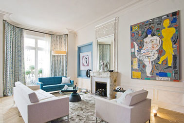 L’ajout de couleurs vives dans votre salon dynamise et modernise l’ambiance du salon et s’intègre dans tous les styles de décoration. Pour intégrer ces couleurs sans toutefois transformer votre salon en kaléidoscope appliquez la règle de base d’une décoration réussie : Trois couleurs au maximum dans une pièce. Pour être sûr de ne pas commettre d’erreur, vous pouvez partir des couleurs d’un des éléments de déco de la pièce ( un tapis, un tableau, un motif de rideaux ou de coussins) et décliner ces couleurs extraites en plusieurs points. Exemple dans ce salon : le bleu que l’on trouve sur la toile est repris pour peindre la niche, le jaune lui est repris avec la couleur de l’abat-jour. Ici canapé et fauteuils sont blancs, vous auriez le même apport de dynamique si leur revêtement était marron ou noir. Donc, n’hésitez pas à introduire des couleurs vives quelque soit le style de votre salon, il y gagnera en modernité et vitalité.