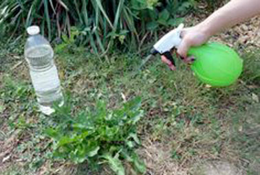 A l’aide d’un pulvérisateur, on applique directement le désherbant naturel et du vinaigre sur les mauvaises herbes de la pelouse afin qu’ils ne viennent pas gêner les autres plantes.