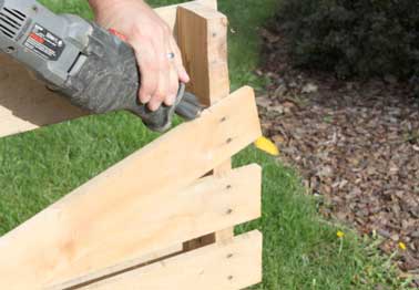 Ne tentez pas de démonter votre palette bois avec des outils traditionnels ! Les palettes industrielles sont construites avec des clous annulaires qui sont très difficiles à retirer. Munissez-vous plutôt d’une scie sabre ou à métaux et placez la palette en bois sur le côté, calée contre un mur et commencez à démonter l’assemblage en sectionnant les clous du haut vers le bas.