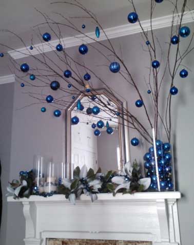 Des boules bleues pour décorer la cheminée à Noël