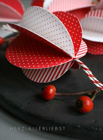 Les boules fabriquées avec des cartons à motifs rouge et blanc sur une assiette en ardoise c’est déco sur la table de Noël,