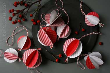 Pour changer des traditionnelles boules de Noël en verre pourquoi ne pas les imaginer en carton ? C’est tout aussi décoratif suspendu dans le sapin de Noël, devant les fenêtres ou pour décorer le centre de table de Noël mêlé à des végétaux, des bougies ou autres guirlandes de Noël.