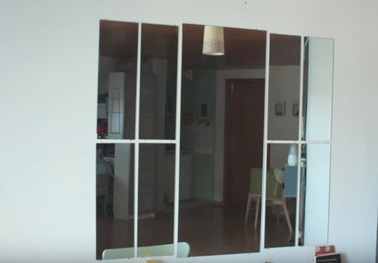 Fixez ensuite les miroirs un à un à l’aide d’adhésif spécial miroir en respectant bien les espaces entre chacun d’eux. Pour être sûr de les coller d’équerre, aidez-vous d’un niveau pour vérifier que la hauteur comme la largeur du miroir est bien droite.