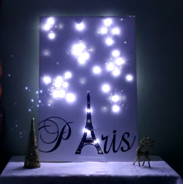 Une toile blanche, un stickers, une guirlande lumineuse et obtenez une oeuvre d'art pleine de lumière. Le plus c'est que, fabriqué par vos soins, elle est personalisable.