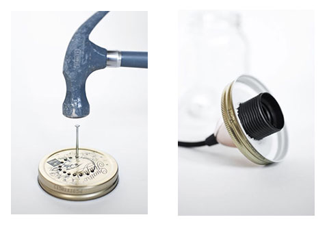 Tout d’abord, faites un trou dans le couvercle de votre pot de récup afin d’y insérer le bout du cable de suspension qui viendra accueillir l’ampoule. Pour un pot au gros gabarit et aux bonnes dimensions pour la réalisation de ce DIY, nous vous conseillons d’utiliser un pot de récup de confiture de la marque Le Parfait. Astuce : Faites des petits trous rapprochés dans le couvercle avec un clou et un marteau afin de faciliter la découpe. N’hésitez pas à appliquer de la colle forte liquide au pinceau afin de maintenir le tout.