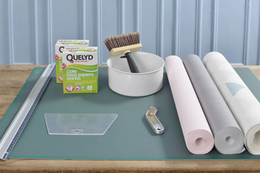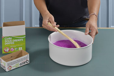 DIY déco réalisé avec la colle à papier peint Quelyd, Prix : 7,50€ en vente dans les magasins et grandes surfaces de bricolage.