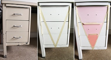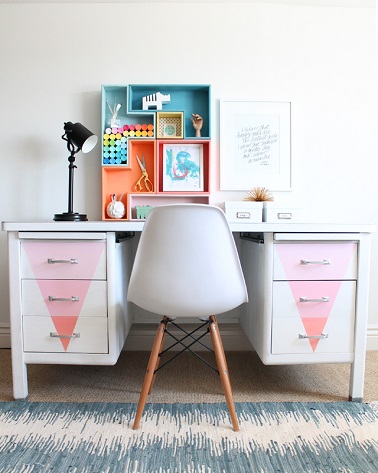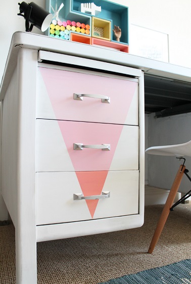 Une fois le bureau repeint vous pouvez laisser aller votre créativité en peignant des formes géométrique sur les tiroirs en vous amusant avec les couleurs de peinture. Utilisez du scotch de masquage pour délimiter la forme à peindre puis peignez les sections de chaque tiroir dans différentes nuances d’une même couleur afin d’obtenir un joli dégradé coloré sur votre bureau.
