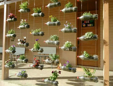 L’idée est simple : récupérez des bouteilles de soda ou eau minérale, percez une ouverture pour mettre le terreau, plantez fleurs et plantes et suspendez le tout sur des fils, une palette bois ou du bambou. Voilà en quelques mots comment faire des jardinières et bacs à fleurs avec des objets de récup et réaliser un mur végétal qui a du charme ! Et pourquoi pas en faire un mini potager. Un DIY qui ne manquera pas de faire parler votre imagination !