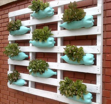 Pour réaliser ce jardin suspendu, commencez par peindre une palette avec de la peinture blanche et les bouteilles plastique dans une lumineuse couleur vert d’eau, (le contraste couleur avec la brique sera très déco) ou toute autre couleur selon la nature du mur. Percez le plastique à l’aide d’un couteau de manière à obtenir une fente de 4 cm de large sur 15 cm de long. Remplir de terreau puis insérer vos plants de fleurs. N’oubliez pas de faire des petits trous sur le bas des bouteilles pour l’évacuation du trop plein d’eau lors de l’arrosage. Enfin, placez les bouteilles de manière à les coincer entre deux traverses de la palette et voilà une jardinière suspendue du plus bel effet et pas chère.