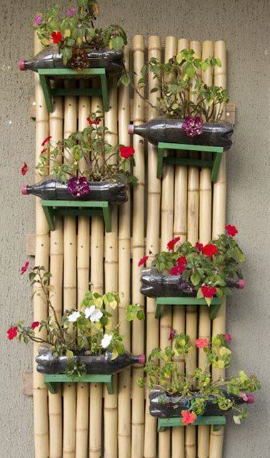 Avec son côté naturel, voici un jardin suspendu qui ne manque pas de charme. Réalisé avec des tuteurs en bambou sur lesquelles sont disposées en quinconce les bouteilles de plastique qui là aussi font office de pot de fleurs. Les bouteilles sont percées de la même manière et accueillent de jolis géraniums nains. Le petit plus : On a ajouté des petites tablettes bois peintes en vert pour un rendu encore plus déco qui servent de supports aux bouteilles fixées par quelques points de colle. Ce mur végétal trouve parfaitement sa place sur un balcon ou une terrasse !