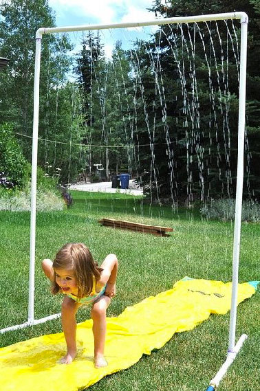Une pluie rafraichissante pour grands et petits avec cette douche inspirant les jeux d’eau à l’extérieur. Pour la construire, du tube PVC de 2.5 cm de diamètre, 2 raccords coudés, 2 raccords en T. Commencez par percer un tube tous les 2 cm. puis enfiler le tuyau d’arrosage sur une longueur de tube. Fixez un raccord coudé puis le tuyau percé et continuez ainsi pour former le U de la douche. Formez les supports de la douche avec le reste de PVC, Ouvrez le robinet d’eau et les enfants courront illico sous la douche ! Pinterest.